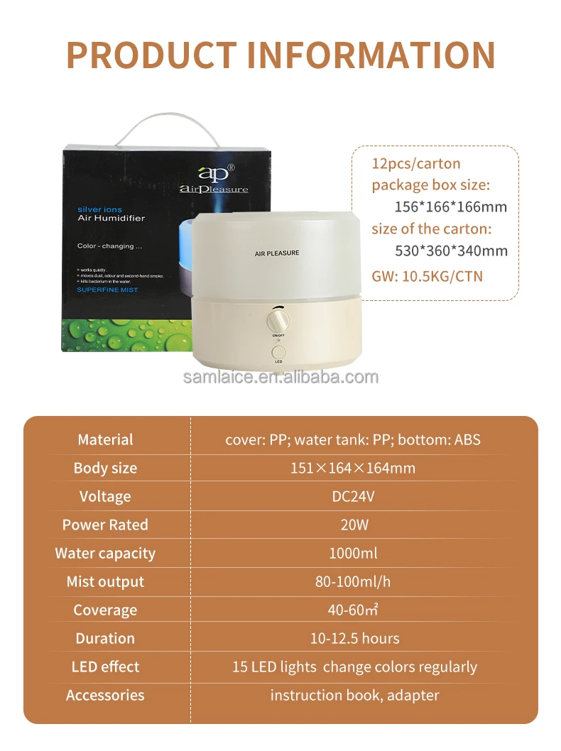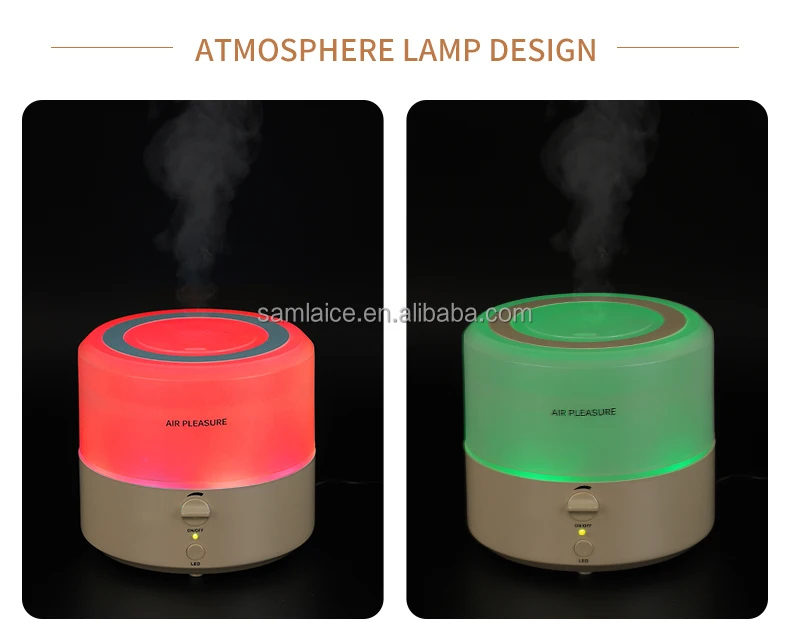1. 8 colors for choice; 2. Auto shut-off when water is running out; 3. Can adjust the mist as you like, the biggest mist output 80-100ml/h 4. Plastic spray lacquer aroma diffuser- it is a gorgeous designed unit that fits in with any décor 5. With silver ion inside; 6. 7 changing mood lights- the light can be turned off or fixed color 7. Ultrasonic technology- it is whisper-quiet and diffuses aroma oil creating a relaxing and good smell environment