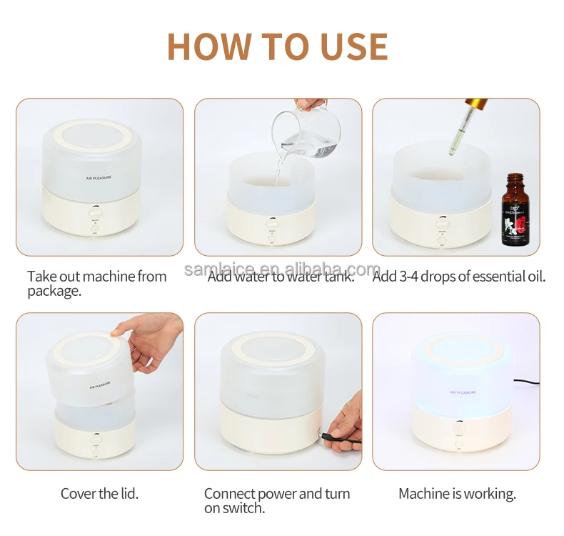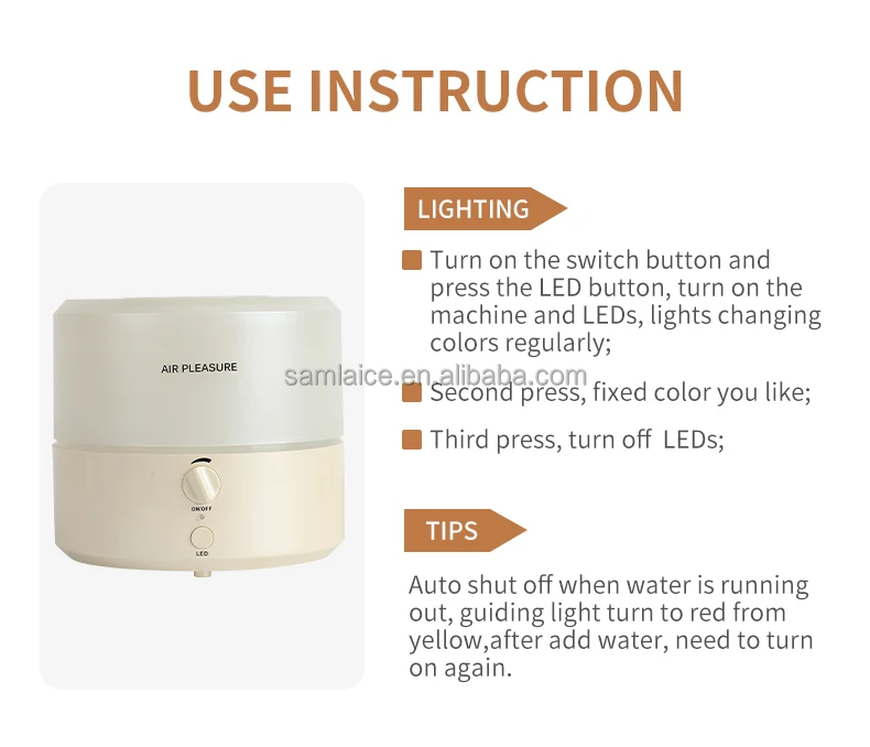 Turn on the switch button and press the LED button, turn on the machine and LEDs, lights changing colors regularly; Second press, fixed color you like; Third press, turn off LEDs; Auto shut off when water is running out, guiding light turn to red from yellow, after add water, after add water, need to turn on again. |