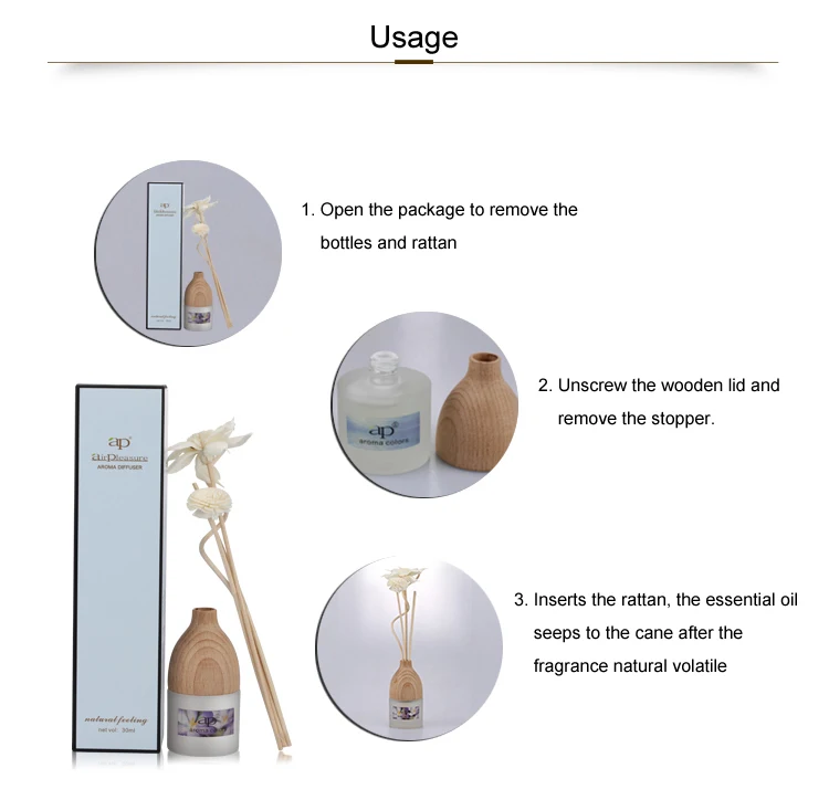 | AP30ml aroma diffuser | Net content:30ml, 6 flavors totally | 48 pcs/carton. The size of the carton: 46.5×35×25 cm (0.041m³) |