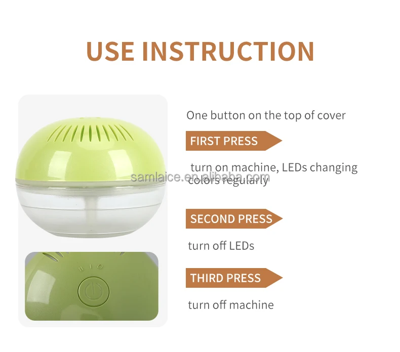 use instruction | One button on the top of cover. First press, turn on machine, LEDs changing colors regularly; second press, turn off LEDs; third press, turn off machine. |