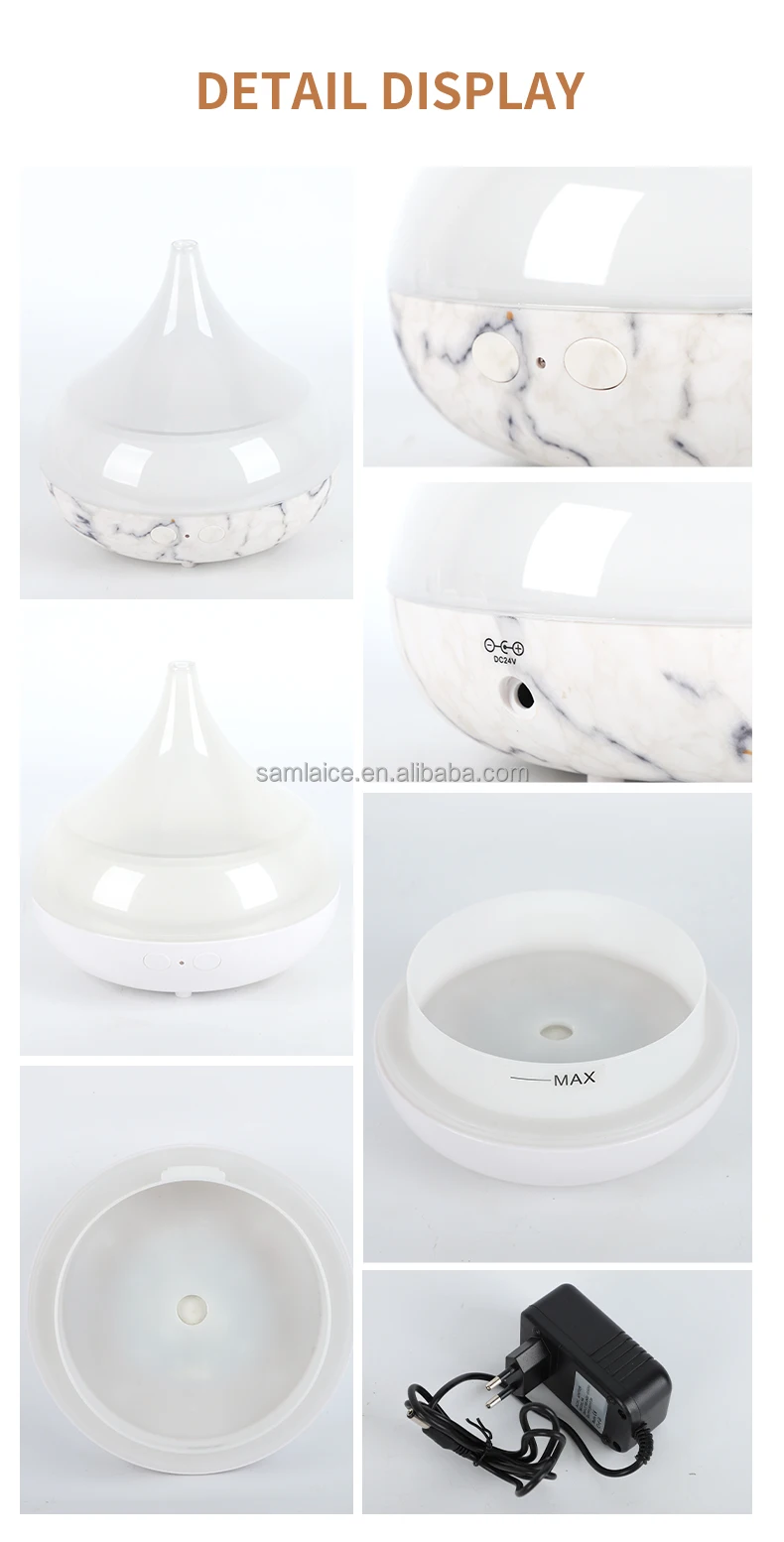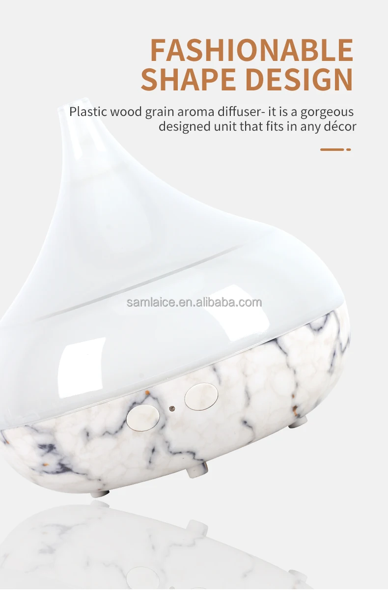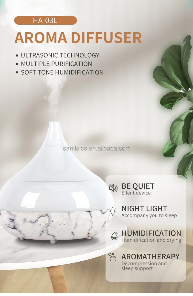 The HA-03L Ultrasonic Aroma Diffuser & Humidifier is a sleek, marble-inspired multi-functional device designed to elevate your indoor environment. With its iconic teardrop silhouette, glossy white top, and marble-patterned base, it blends seamlessly with modern, minimalist decor. Powered by advanced ultrasonic technology, it delivers three adjustable mist levels (weak/medium/strong) while diffusing essential oils, creating a personalized aromatherapy experience. The 7-color LED mood lights cycle through vibrant hues, doubling as a nightlight for relaxation or sleep. Whisper-quiet operation and auto shut-off protection make it ideal for bedrooms, living rooms, and offices.