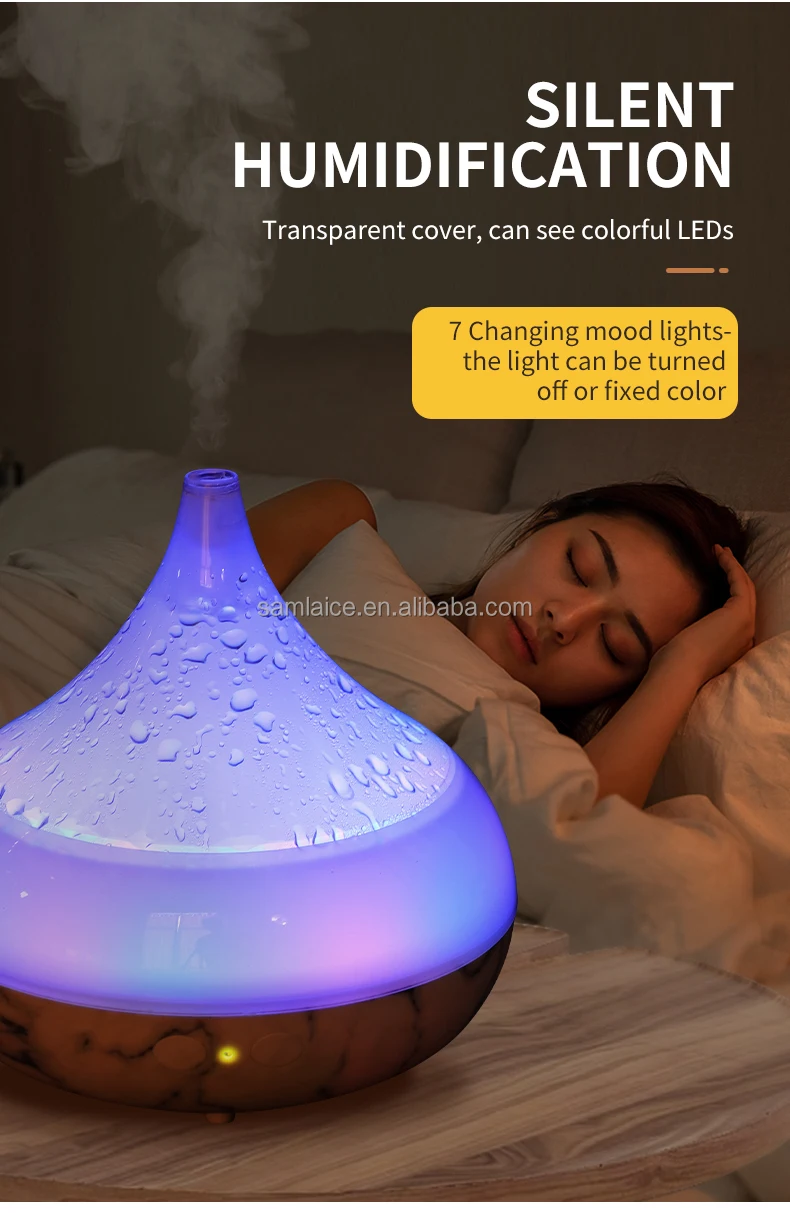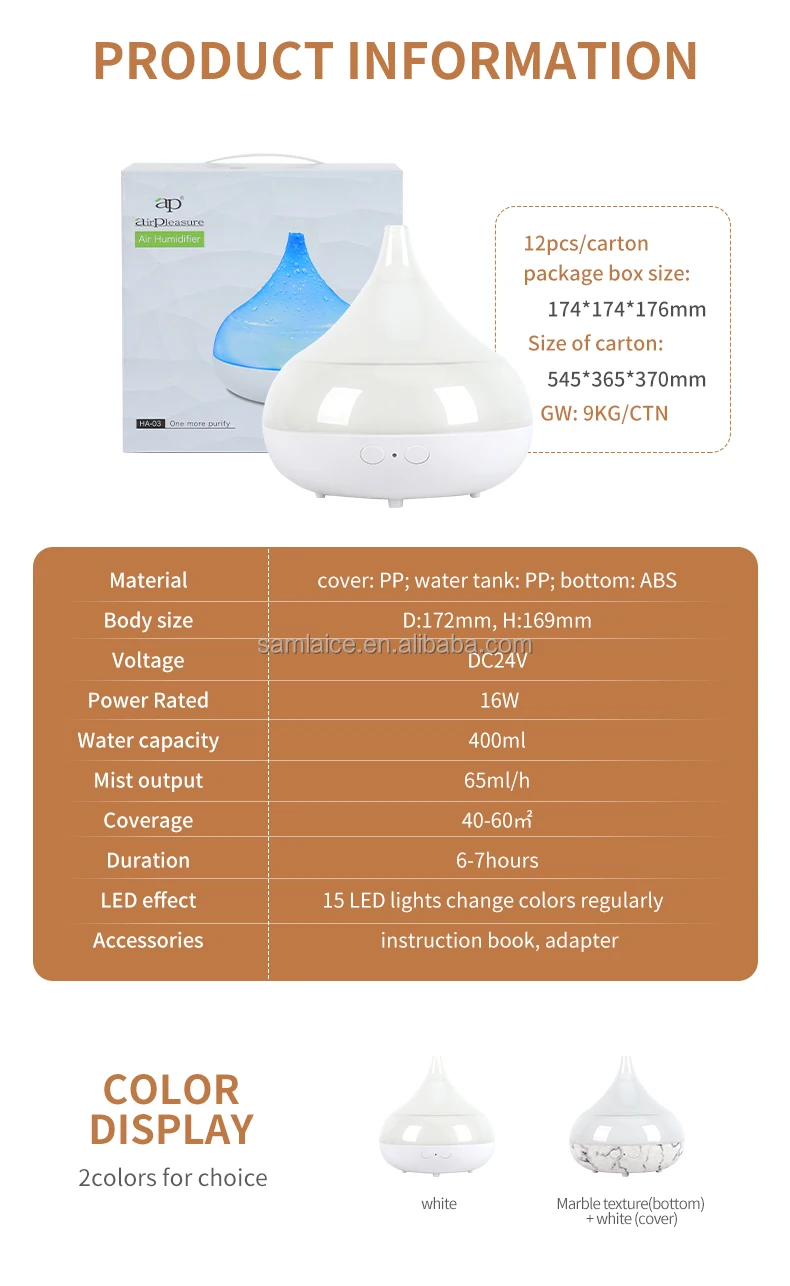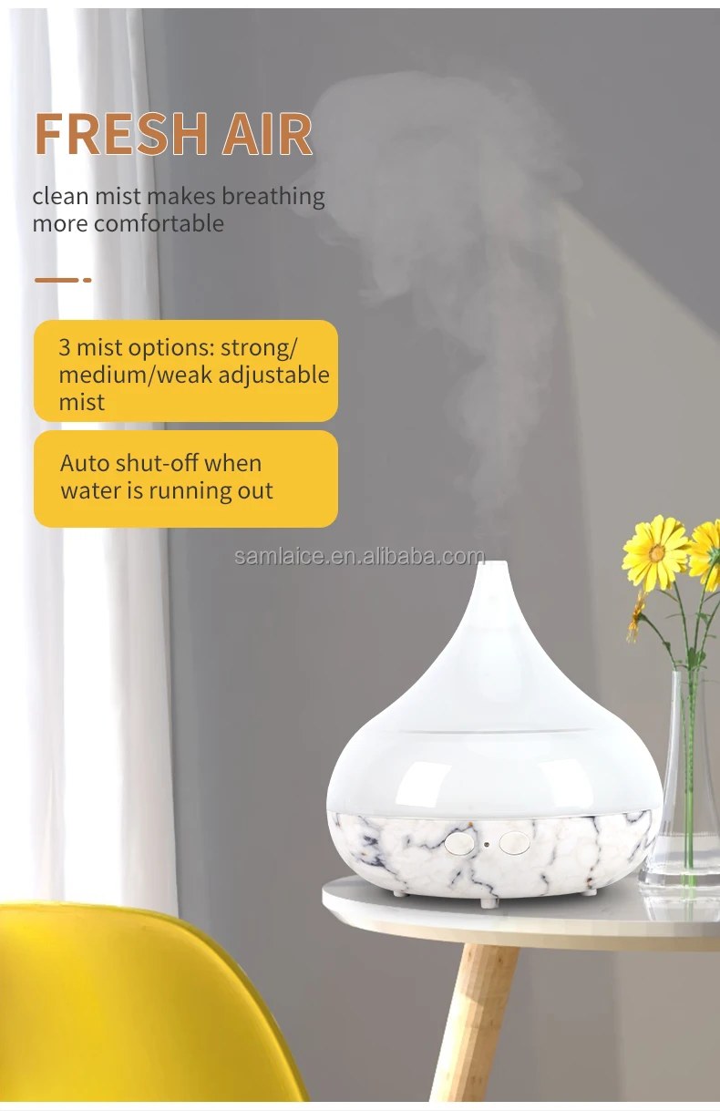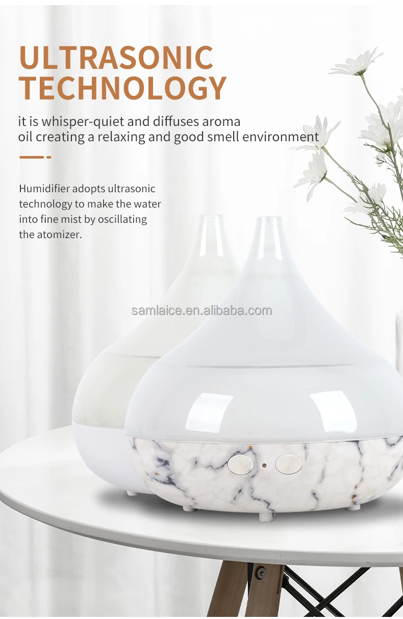 The HA-03L Ultrasonic Aroma Diffuser & Humidifier is a sleek, marble-inspired multi-functional device designed to elevate your indoor environment. With its iconic teardrop silhouette, glossy white top, and marble-patterned base, it blends seamlessly with modern, minimalist decor. Powered by advanced ultrasonic technology, it delivers three adjustable mist levels (weak/medium/strong) while diffusing essential oils, creating a personalized aromatherapy experience. The 7-color LED mood lights cycle through vibrant hues, doubling as a nightlight for relaxation or sleep. Whisper-quiet operation and auto shut-off protection make it ideal for bedrooms, living rooms, and offices.
