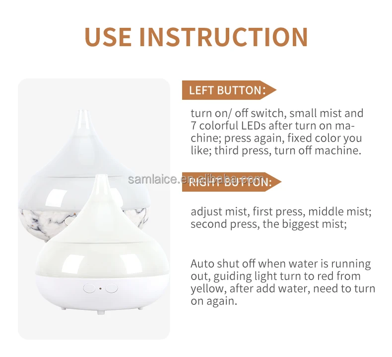 use instruction | Left button: turn on/ off switch, small mist and 7 colorful LEDs after turn on machine; press again, fixed color you like; third press, turn off machine. Right button: adjust mist, first press, middle mist; second press, the biggest mist; Auto shut off when water is running out, guiding light turn to red from yellow, after add water, need to turn on again. |